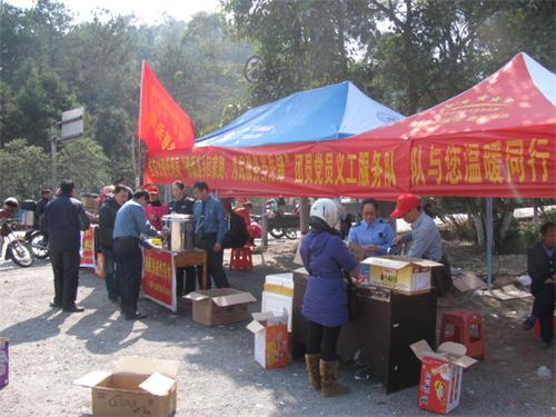 2014年春节即将到来,面对到来的农民工返乡潮,为确保务工人员人身和财产安全,2014年1月25日,岑溪市公安局昙容派出所会同桂东公路局等相关部门,组织党员民警组建党员义工服务队,为途经此地的返乡农民工兄弟提供各项便民服务,让春运回家路平安温暖。并加强对返乡务工人员的法律法规和安全防范方面的宣传教育,提高他们的法律意识和安全意识,积极预防和减少侵害案件和交通事故的发生。
