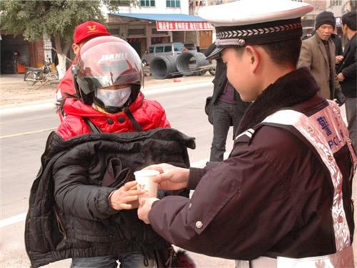 2月6日下午1时许,从柳州三江驾驶摩托车返广东江门市的农民工陈先生行驶到龙圩区环城路时,被交警打手势要求靠边停车,他正要拿出证件时,交警走上来却说:“兄弟,累不累呀。来喝杯热茶休息一下吧。”一个胸前挂着“西江党员义工”的男青年给他送来了热腾腾的茶水。温暖和感动驱除了陈先生旅途的疲劳。春运启动以来,成千上万像陈先生这样驾驶了几个小时摩托车的驾驶员能够在该服务站喝杯热茶,休息十来分钟,补充能量重新踏上征程。
