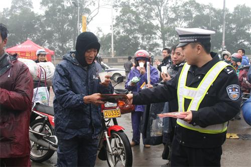 2月6日下午1时许,从柳州三江驾驶摩托车返广东江门市的农民工陈先生行驶到龙圩区环城路时,被交警打手势要求靠边停车,他正要拿出证件时,交警走上来却说:“兄弟,累不累呀。来喝杯热茶休息一下吧。”一个胸前挂着“西江党员义工”的男青年给他送来了热腾腾的茶水。温暖和感动驱除了陈先生旅途的疲劳。春运启动以来,成千上万像陈先生这样驾驶了几个小时摩托车的驾驶员能够在该服务站喝杯热茶,休息十来分钟,补充能量重新踏上征程。