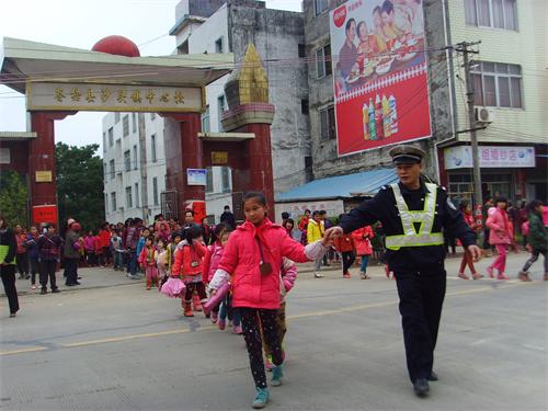 “辖区交警中队要在学校门口设立护学岗,护送学生安全过马路。”交警在马路中拉起2条鲜红的绸布筑起了“平安墙”,邓金远一边和民警拉着学生的手护送过国道207线公路,一边交代民警道。