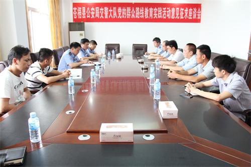 4月22日下午,苍梧交警大队根据党的群众路线教育实践活动的部署,集中县内客货运输企业召开征求意见座谈会。广泛听取企业法人代表的意见和建议,零距离倾听群众的呼声,通过征求意见座谈会,扎实开展党的群众路线教育实践活动,推动苍梧县道路交通管理工作开展。