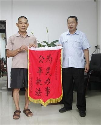 6月17日,南渡镇居民陈大叔将一面写有“公平执法,为民办事”的锦旗送到了岑溪市人民法院执行局谢文达局长手里,以感谢执行局法官成功执结他儿子申请的长达十多年的案件。