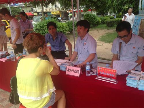 虽然正值炎炎夏日,但人民群众的热情却没有因此退却,特别是在龙圩法院摆设的免费法律咨询的摊点前,前来寻求法律帮助的老百姓络绎不绝。“我丈夫被人殴打成了轻伤,要如何维护我们的合法权益?”“ 我的雇主毫无理由将我解雇了,这情况可以得到赔偿吗?”“我丈夫已下落不明好几年了,我可以到法院起诉要求离婚吗?”“……”面对群众一个个不同的问题,龙圩法院的法官们一边分派精心印制的法制宣传资料,一边用笔将群众的问题记录到纸上,再一一回答。一位刘姓大爷在经过长达半小时的咨询得到满意的答复后,向法官递上了新鲜清甜的荔枝。法官不假思索将荔枝塞回老大爷的手里:“大爷,我们不渴,这是我们应该做的!”
