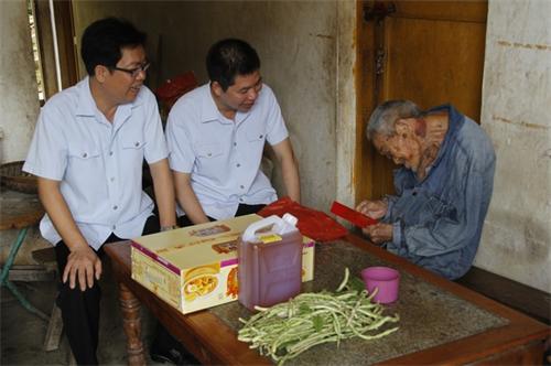 五保户黄少全,今年72岁,原来是村里的护林员,作为一个有40多年党龄的老党员,他把自己的一生奉献给了山林,一直没有成家。当得知慰问小组的到来,黄少全热情地出门迎接。在黄少全家中,慰问小组和老人拉家常,了解老人的生活情况和健康状况,并对他多年来对党的忠诚付出表示敬意。
