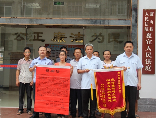 2014年7月1日,陈某某、黄某某一行8人代表19名农民工给夏宜人民法庭送上锦旗和感谢信。