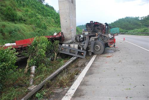 据了解,2014年8月12日15时许,安徽省阜阳市驾驶员孙 标驾驶一辆车号为皖KE1361/贑K7630挂重型牵引车满载蔬菜及鲜花,从云南往广州。当到达岑兴高速公路293KM处时,因驾驶员疲劳驾车撞到该路段的天桥中间桥墩及护栏,货车车头侧翻脱落,车上满载的蔬菜及鲜花抛洒公路上行线及下行线路面。正在此时,一辆由南宁市西乡区黄剑雄驾驶的桂AHG316号小型轿车高速通过事故现场下行线,在下行线快车道行驶的黄剑雄发现事故车抛花占道情况时,快速反应打方向躲闪,由于遭受横祸,引发小车侧翻滑进公路路边山坡。此事故造成随车的小车驾驶员的母亲受伤,两车严重受损,高速公路中间护栏50多米受损,蔬菜鲜花散落满地,现场一片狼藉,岑兴高速公路交通严重受阻,幸无人员死亡。