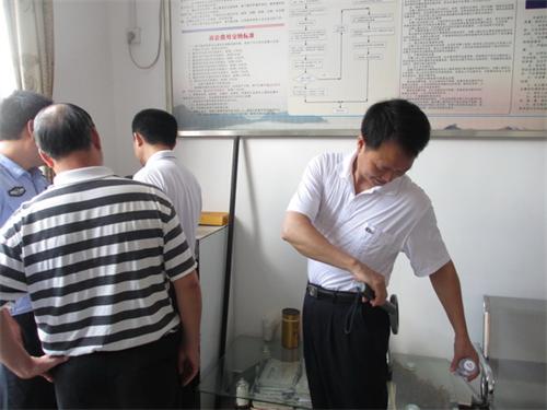 市中院法警支队周炳东副政委(右)检查探测仪使用情况