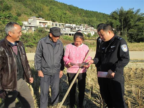 “大家外出务工要签订用工合同,遇到维权可以有依据;还有岁末年关,大家要注意居家安全……”派出所民警李俊海宣传资料为正在地里忙冬种的村民传授一些维权和治安、反邪教等防范的知识。