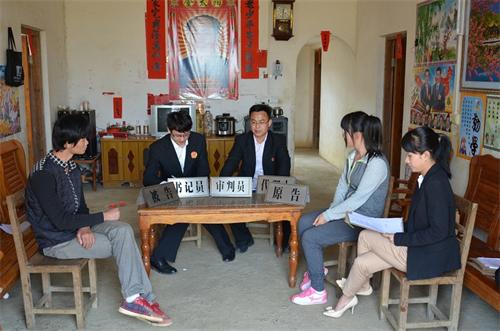 庭审当天一大早,法官们便驱车出发。经过一个多小时的颠簸,终于到达了庭审目的地—被告的家中。这是一处位于深山中简陋的农家小舍。只有一张桌子和几张凳子。条件虽简单,但也可因地制宜。一张桌子的正中坐着法官和书记员,两边紧挨着则分别是原、被告及律师。经过简单的布置,一场别开生面的庭审马上开始。听说法院的“巡回法庭”将要在这里开庭,周围的村民邻居早早就聚集在这里,等着上一堂“法制大课”。