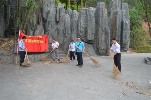五一劳动节前夕,为了让市民在节日期间享有一个清洁的休闲锻炼好去处,岑溪法院团支部组织干警十余人来到东山公园扫地。活动中,尽管天气炎热,干警们有的扫地,有的铲垃圾,有的除干草,干得热火朝天。经过两个多小时的劳动,东山公园门口一路的垃圾终于被清理干净。看着清洁的路面,干警们纷纷表示,在五一劳动节到来前,通过自己的劳动给岑溪市民和游客送上一份“节日礼物”,感觉很有意义。