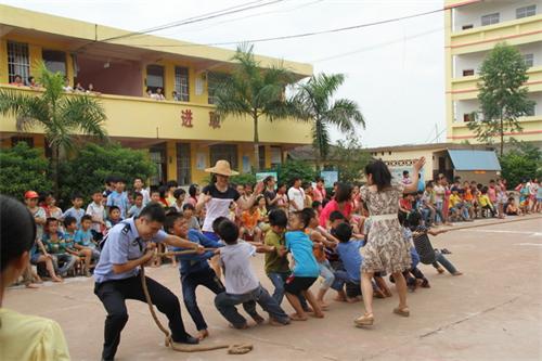 “六一”儿童机将至,藤县法院干警一行6人来到塘步镇中心校,看望在该校就读的在一起交通事故受伤的周某锋小朋友。一行6人还未走进校园,就听到从校园里传出来的“加油加油”的呐喊声,原来该校正在举行“六一”儿童节拔河比赛。看到洋溢在学生们脸上的笑容,聆听着他们的欢笑声,法院干警也受到感染,决定加入他们的比赛。看到穿着威武制服的叔叔也加进来,操场上更是群情涌动,欢呼声不断。