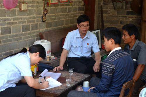 在男子的对面,几名汗流浃背的法官,是苍梧法院刑庭钟钊生庭长、陈娟燕副庭长及庭室书记员,他们驱车3个多小时从苍梧来到贺州市八步区信都镇,因为山路崎岖难以行车,又不得不在中午顶着烈日步行3公里,才来到了北联村欧东组。