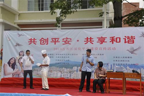 为切实提高市民群众识邪防邪意识和水平,不断扩展反邪教宣传思想阵地主战场,活动期间,万秀区倾心打造的反邪教专场文艺汇演,在该市旺城广场、乡镇、社区举行,为广大群众献上了一场主题鲜明的反邪教文艺大餐,也给闷热的夏夜送来丝丝清凉。