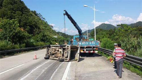 梧州市交警支队高速公路管理三大队接到报警后,立即出警赶往现场,到达现场发现事故地点正位于广昆高速公路兰冲隧道出口前100余米处,车辆侧翻横卧在高速行车道上,情况十分危险。