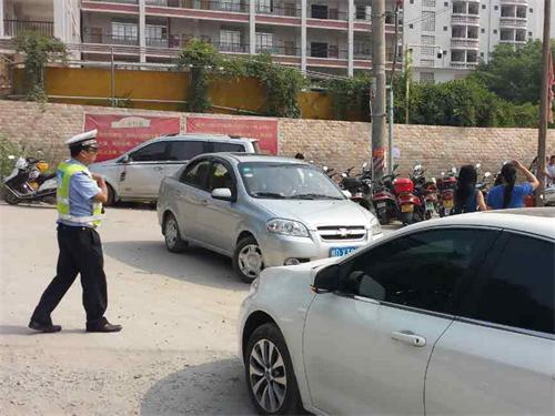 8月26日上午,市第八中学迎来了2015年入学的高一新生。由于该校为住宿学校,高一新生入学报到时会有很多行李,大多由家长负责开车送学;另外由于通往学校的白云路进行封闭施工,接送车辆都要绕行旁边临时开辟的便道,而便道的路况较差、交通趋于饱和,因此交通压力非常大。大队针对以上情况专门提前制定了详细的工作方案进行部署,适时调整勤务,设立了“交警护学岗”,民警在现场一边指挥学生、家长安全过马路,一边及时引导家长接送车,做到有序停放,使得学校及其周边道路交通秩序有条不紊,不出现大面积堵塞现象。