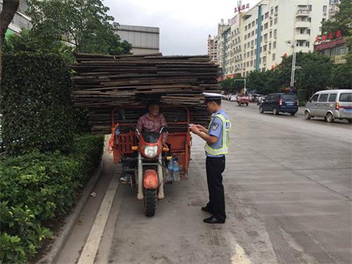 (长洲交警大队查获一辆无证超高超宽载货的无牌三轮车)
