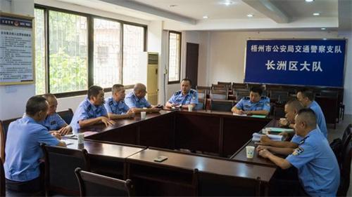 到了长洲交警大队,检查组顾不上休息就开始了督导检查工作。首先,支队政委邹海政委作为代表向检查组介绍了长洲交警大队的基本情。随后,黄大队长从三个方面汇报了大队工作主要情况。一是长洲交警大队“五个一”统一行动每个波次专项整治行动的情况,在自治区总队和梧州市支队的领导和指挥下,长洲区交警大队积极开展打非治违专项行动,有效了打击了各类机动车违法违规行为,净化了道路交通环境;二是打非治违行动中校车整治的工作进展和下一步工作安排,在校车整治行动中,长洲交警大队已经深入了辖区银湖、红苹果、城市中心、大红花等四家幼儿园开展了校车检查工作,未来大队还将继续深入辖区个中小学校开展检查工作,保障孩子们能开开心心出门,平平安安回家;三是长洲交警大队“两会一节”安保工作的情况,“两会一节”安保工作中长洲交警大队全警出动,力保辖区道路平稳、通畅。在听完黄大队长的汇报后,检查组对长洲交警大队的工作表示了肯定。接着,邹海政委和检查组就“两会一节”安保和打非治违工作开展进行了交流,并提出了建议:一是长洲交警大队所管辖的区域人流量、长流量大,交通管理力度仍需加强;二是要科学调配警力,提高路面见警率,加强对交通违法违规行为的打击力度。三是加强交通法制安全教育,引导群众文明驾驶、平安驾驶。