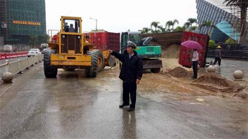据民警了解得知,这辆牌号为桂D17***的泥头车是因为超载,加之雨天泥土重量增加导致车身过重压坏路基才造成的侧翻,当时驾驶员没有坐在驾驶位上幸运的逃过了一劫,事件没有造成人员受伤,但侧翻的泥土差点掩埋了旁边过路的小轿车,事件造成了舜帝大道进城方面交通大阻塞。民警在了解情况后立即安排人员在来车方向摆放好警示锥筒,指挥大型车辆有序停放在安全地带,小型车辆缓速通过事故路段,预防二次事故的发生;同时民警立即联系施救车辆和环卫部门对车辆和洒落的泥土进行清理,尽快恢复道路正常交通秩序。为了能及时通报道路交通情况,民警还通过广播、微信、微博等方式向广大驾驶人通报路况信息,引导广大交通出行者合理选择出行路线和时间。