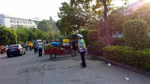 早上7时,民警来到了果蔬批发市场大门口,发现经过了昨日的整治后,果蔬批发市场门口路段及其周边道路的乱停放乱占道行为有了一定程度的改观,但依然有不少的小摊贩和行人在道路两边乱乱占道乱停放,这严重影响了机场路及其周边道路的正常交通秩序。民警立即开展交通疏导工作,劝离违规占道的小摊贩们,通过高音喇叭寻找乱停放车辆的车主。经过民警的反复劝导和喊话,大多数小摊贩都能及时将自己占道经营的三轮车驶离道路两边,对于少数车主不听劝导且车辆严重影响道路交通秩序的占道三轮车采取拍照固定证据,将违规停放车辆拖走的方式进行处理。同时,民警也在路面上开展交通疏导指挥工作,引导车辆有序通过该路段,经过了民警近一个半小时的努力,机场路果蔬批发市场门口及周边路段的交通秩序良好,车流、人流能平稳、有序通过该路段。