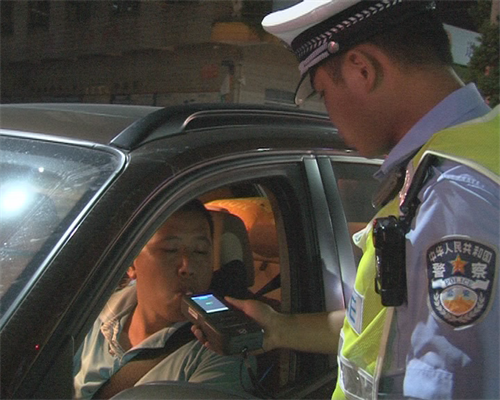 民警:我们需要现场对你进行酒精现场测试,请你配合!这是酒精测试仪,请你用力对着仪器吹气,大概十秒钟。(吹完)