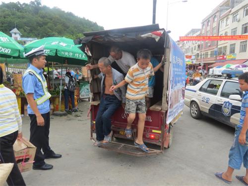 9月26日,苍梧交警大队旺甫中队在路面执勤执法时查处了一辆违法载人的三轮摩托车,及时消除了一起安全隐患,该车为正三轮载货摩托车,车上搭乘7人。