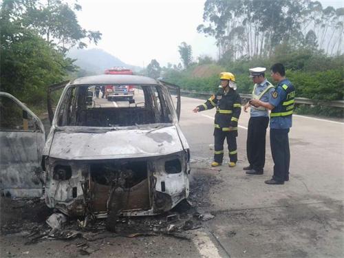 2015年10月1日中午时分,在S50线岑罗高速公路往罗定方向18公里处,一辆面包车发生自燃,虽经消防官兵全力灭火,但面包车最终烧得只剩空壳,所幸无人员伤亡。
