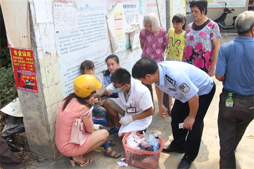 (民警协助医生对受伤小孩进行简单的护理包扎)