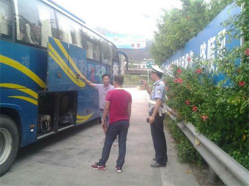 2015年10月1日17时40分许,一辆悬挂着粤H牌照的大客车,在G65线包茂高速公路往玉林方向2843公里处(岑溪收费站附近),司机不顾乘客的安全,随意在高速公路上停车上下客,被梧州市交警支队高速三大队巡逻民警逮个正着。民警发现后,迅速取证,为了维持高速公路上的良好通行秩序,及时消除安全隐患,巡逻民利用警车引导大客车到下一个高速公路出口进行进一步处理。