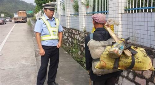 2015年10月1日上午九时,巡逻民警到达岑溪收费站时发现一拾荒老人欲走上高速公路,民警立即上前制止,并告知老人在高速公路步行的危险性,要求收费站工作人员加强对行人进入高速公路的管控力度。