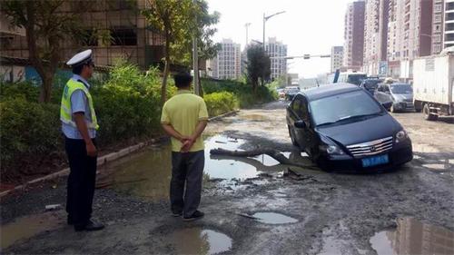 由于红岭路正在进行道路升级改造工程,路上坑洼较多,加之“彩虹”台风降雨影响,不少的大坑内积满了雨水对车辆的正常行驶造成了一定的影响,为了保障车辆进行的安全民警除了设立交通执勤点外还在一些大的水坑边设立了警示锥筒提醒过往驾驶员留意路况,不要冒险通过,在民警的指挥和提醒下大部分机动车辆都能有序通过,但也有小部分车主归家心切无视民警指挥和警示锥筒随意行驶。10月7日的下午3时40分左右,在长洲辖区红岭路上一辆牌号为粤G TJ***的黑色小轿车驾驶员就因为无视民警指挥和警示锥筒而把车辆卡在水坑里。