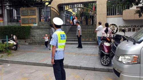 灏景黄金幼儿园位于长洲辖区菊湖路中段,周围有数个大型住宅小区,人流、车流较多交通压力大。为了缓解幼儿园上学、放学时段交通拥堵情况,同时大队还和幼儿园管理方面沟通合作,在上学、放学时间安排老师或保安协助民警开展交通指挥疏导工作,引导在学校门前路段接送幼儿车辆按指挥停放,要做到在不影响其他车辆通行的前提下,有序停放,做到接到幼儿后立即驶离。