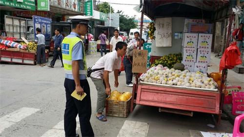 (严处商贩车辆在街边占道摆摊经营)