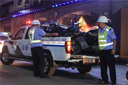 晚上11点整第二阶段行动开始,盘副政委带领所有警员对市区内数家大型KTV、酒吧等娱乐场所进行的停车场进行清查,将所有无牌无证燃油车、非法改装车、报废车依法查扣,并做好相关记录。