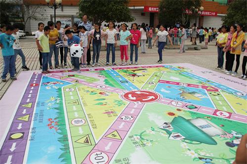 小学生扮成一颗颗小棋子,行走在巨型 “飞行棋”棋盘上,一道道交通安全知识问题“拦”在他们面前,参赛的“棋子”答对问题才可继续前行。