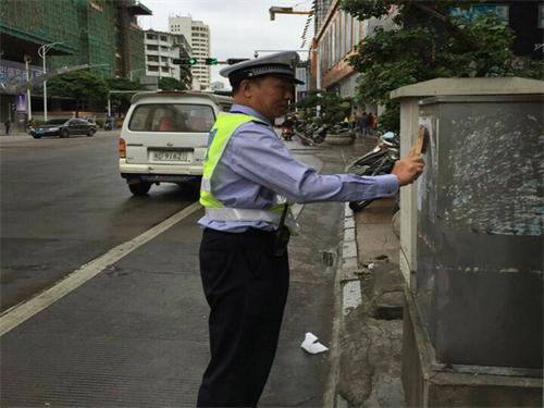 路牌路标、交通标志标牌、安全宣传牌、岗亭等是一种重要的交通语言服务设施,亦是反映城市形象的一扇窗口;但是个别商家、群众为追求个人利益,随意非法乱粘乱贴、乱涂乱画“牛皮癣”,严重影响城市形象。为优化城市交通设施,为区运会的开展打造一个良好的社会交通环境,日前,万秀大队组织开展集中清理小广告行动。
