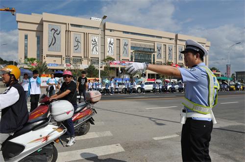 中午1时,在中恒体育场正门前,交警唐苏辉已经在忙碌着指挥来往的车辆。他身着执勤警服,穿着反光衣,头戴白色警帽,双手戴着一副白手袜。他用手势指挥着交通,根据车流人流情况,时而放行车辆,时而指挥车辆停止前进,礼让行人先行通过。在他指挥下,体育场正门前道路的车辆有序地通行。