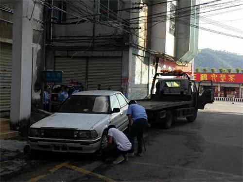 11月23日,梧州市交警支队长洲大队拖移了一辆小汽车长期乱停放在长洲区三龙大道龙鱼转盘路段某工地外的小车。