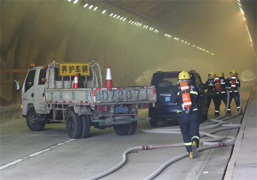 当天上午9点30分,演练正式开始。梧州市马梧高速公路上行线飞田隧道内(梧州段)一辆小车发生事故起火燃烧,产生浓烟(现场无人员伤亡),导致隧道内堵塞。