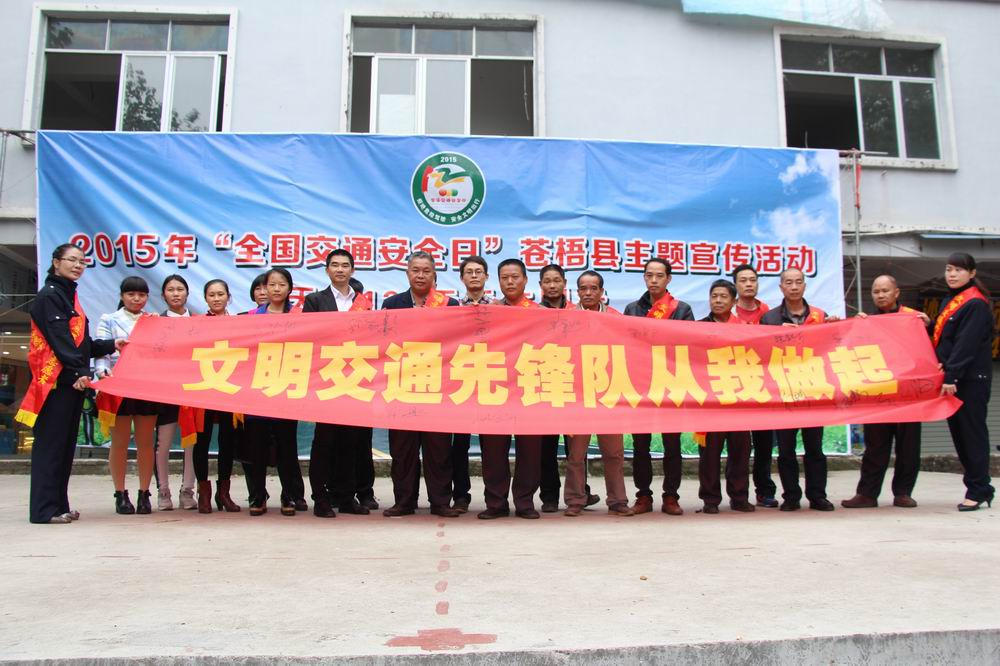 为了使“全国交通安全日”家喻户晓,人人皆知,苍梧交警大队创新工作思路开展多种形式的宣传活动。组织客运车辆驾驶人到沙头镇政府广场参加宣誓、签名活动。同时深入到合水中学、龙洞小学举办发放小黄帽仪式,叮嘱学生平安出行。组织利辉矿业有限公司的驾驶人学习《刑法修正案(九)》等交通安全法律法规常识,告诫驾驶人拒绝危险驾驶、安全出行。为了提高农村群众的交通安全意识,民警还深入到岭脚镇金田村组织村民、学生、老师开展“拒绝乘坐安全隐患车辆、安全文明出行”宣传活动,叮嘱农村群众、学校师生一定要拒绝乘坐拖拉机、农用车、报废车等存在安全隐患的车辆。在隆顺机动车驾驶员培训学校,车管中队的民警向学员讲解交通安全法律法规常识,宣传文明交通理念,叮嘱学员自觉做到“礼让斑马线、安全文明出行”,做文明驾驶员、文明市民。在每一个宣传活动点,机动车驾驶人、农村群众、驾校学员分别在印有“文明先锋从我做起“拒绝危险驾驶、安全文明出行”、 “拒绝乘坐安全隐患车辆、安全出行”、“礼让斑马线、安全文明出行”的大幅红布上郑重签上自己的名字。