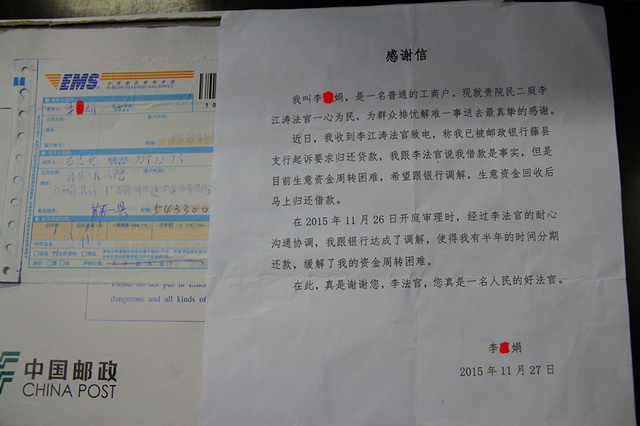 事后,李某娟甚是感谢李江涛法官的耐心调解,使得其生意资金周转困难的局面得到极大缓解,为此其写上一封感谢信寄到了石院长的手里,于是就有了开头的一幕。