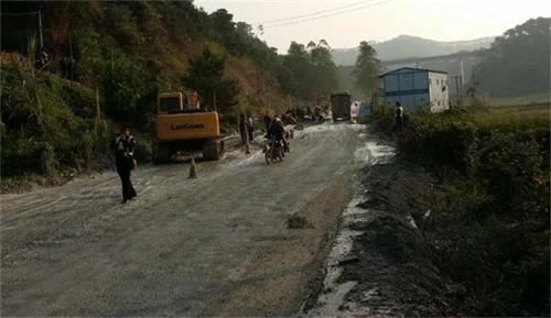 藤县琅南路段路面正在铺路施工,南安中队协助路政大队对道路交通进行维持工作,由于该道路过往车流量大,道路狭窄,交警在施工路段两端指挥车辆单向通行,确保道路交通安全。