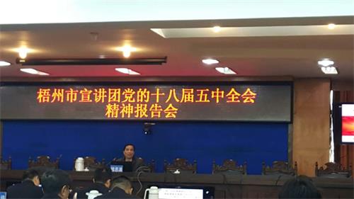 12月21日9时,高速三大队田伟萍指导员参加了在江南办公楼召开的梧州市宣讲团党的十八届五中全会精神报告会,会议由中共梧州市委党校楼恩满讲授了十八届五中全会精神。
