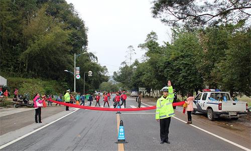 每当傍晚放学,当位于国道321线沿线学校的学生们有说有笑地走出校门。在这里,他们看到了交警叔叔熟悉的身影,以及两条横跨马路的红绢布。“来,同学们,从这里过马路。”蒙山交警大队黄村中队的中队长卢一宪笑着对学生们说道。长长的红绢布,是蒙山交警大队自创的人工红绿灯,为一批又一批学生的安全过马路护航。