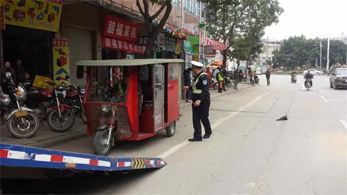 为有效预防和减少因三轮摩托车引发的道路交通事故,积极加强辖区道路交通管理, 2016年1月12日,龙圩交警大队积极组织警力在辖区开展三轮摩托车、电动三轮车、电动四轮车交通违法行为整治行动,全面净化辖区涉及此三类车辆道路交通违法行为,为广大群众平安出行创造良好的交通环境。
