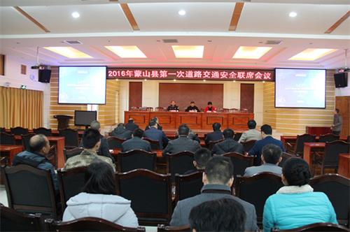 1月20日,蒙山县在县行政中心大楼附楼会议室召开了2016年第一季度道路交通安全工作联席会议,县道路交通安全联席会总召集人、副县长陈斌,联席办主任、公安局党委副书记李庆斌、各乡镇主要领导以及县道路交通安全联席会议成员单位领导参加了会议。