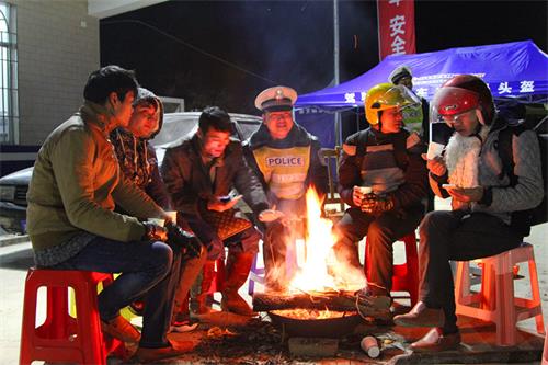 民警燃起熊熊篝火让让返乡族们可以取暖