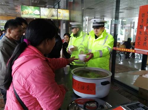 “辛苦了,喝杯热姜糖水暖暖身子吧”在副大队长黄远鹏的带领下,执勤民警和服务区工作人员引导返乡群众和司机朋友进站休息,热情给他们送上热腾腾的免费姜糖水,并亲切叮咛返乡群众和司机朋友天气寒冷,路面湿滑,启程路上要注意安全,小心行驶,平安回家团圆。返乡群众和司机朋友接过姜糖水,连连感谢民警和服务区工作人员,直道寒风冰雨都不用畏惧了,回家途中有温暖相送,真贴心。