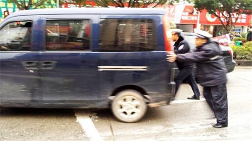 1月23日晚上6时左右,在新兴三路凯菜酒店路口西往东的直行车道有一辆面包车在等待红绿灯的时候突然熄火,无法正常启动,由于正值下班高峰期,该段道路车流量较大,在道路中间无法动弹的面包车造成后面等候放灯的车辆无法正常通行,道路出现了交通堵塞情况,而故障车辆驾驶员一人也无法把车移走,正急得满头大汗。就在这时进行交通巡查工作的长洲交警大队正好经过此路段,并发现了故障车辆。