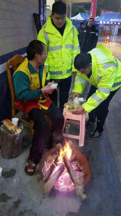 执勤民警循声往去,该男子全身上下已经湿透,脚上穿着一双凉鞋,看上去全身僵硬了。民警林庆良和协警小植将他带到火炉旁取暖,一人去取姜糖水、一人拿面包,协警老李还上楼盛了一碗热腾腾的稀饭。
