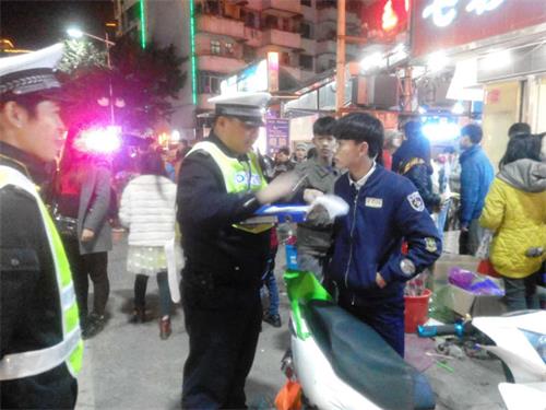 2月14日傍晚,岑溪市公安局交通管理大队的蒋警官梳好头发,换上笔挺的警服,端正了白色大檐帽,刷亮了黑皮鞋,套好亮黄的反光衣,神采奕奕地出门过节去了。